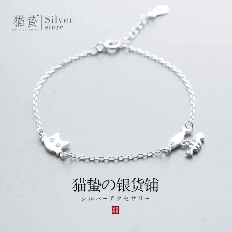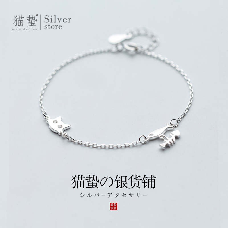 Cat sting S925 sterling silver bracelet female Korean version of the cat fishbone diamond set small fresh cute simple student best friend jewelry