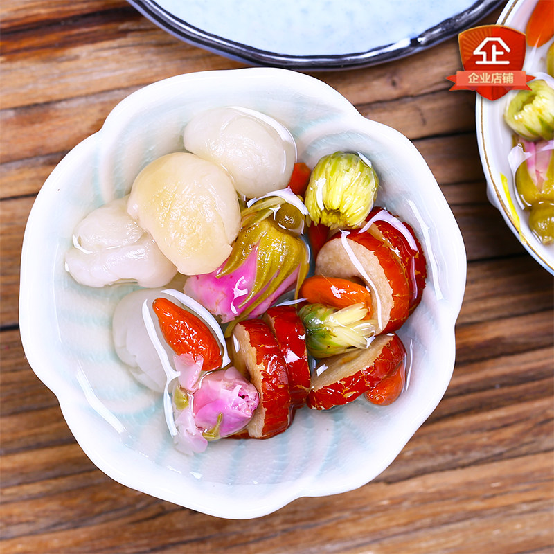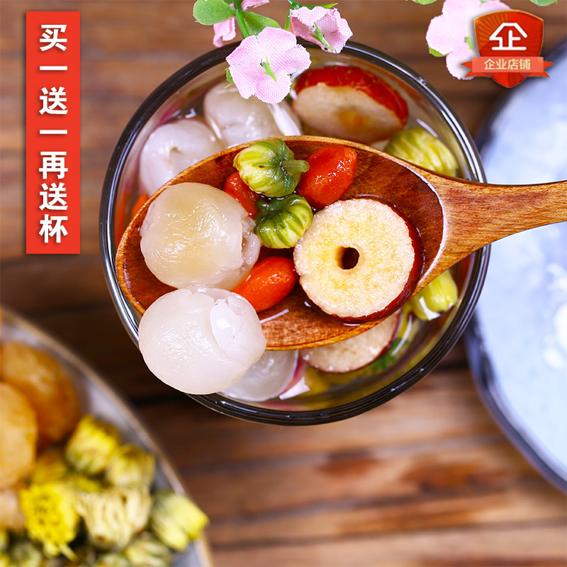 Double rose, wolfberry, jujube, dried longan, meat, fetal chrysanthemum, rock sugar
