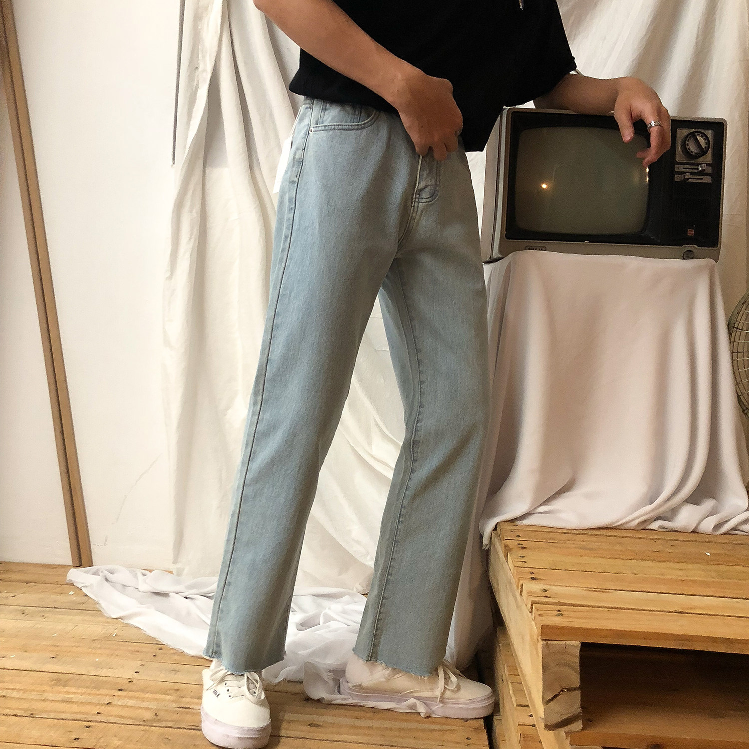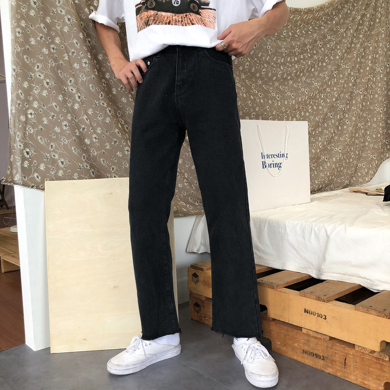 19studio wool edge Korean version wide pants trendy 100 lap wind ulzzang Loose Straight Drum Jeans Male Tide