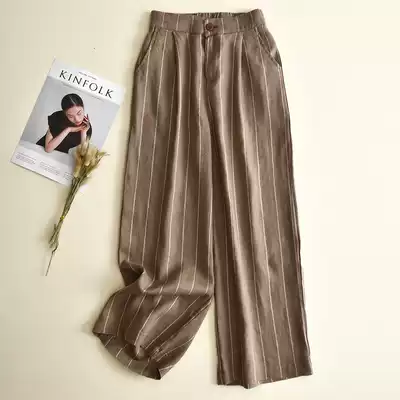 Pure linen wide-leg pants women's summer thin 2021 casual literary high-waist straight striped cotton and linen nine-point pants women