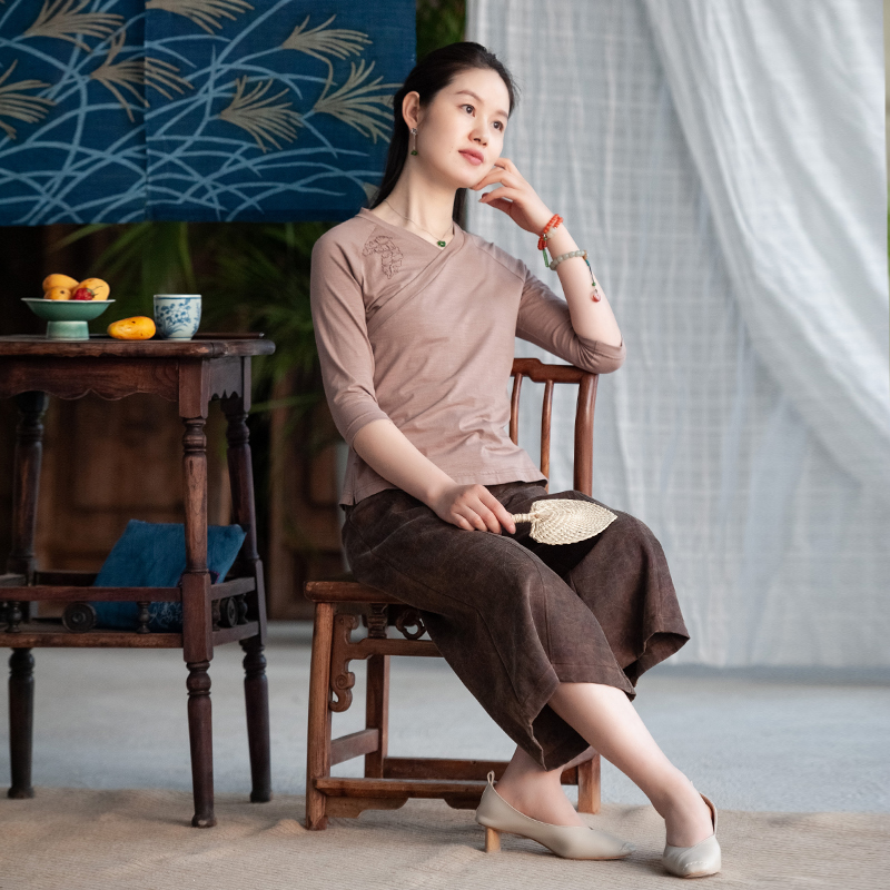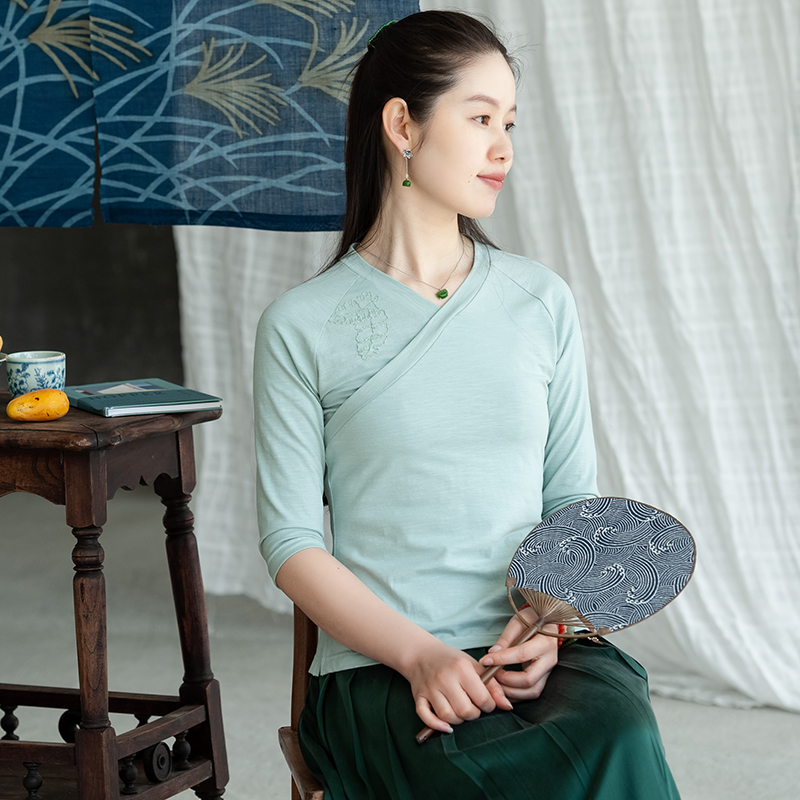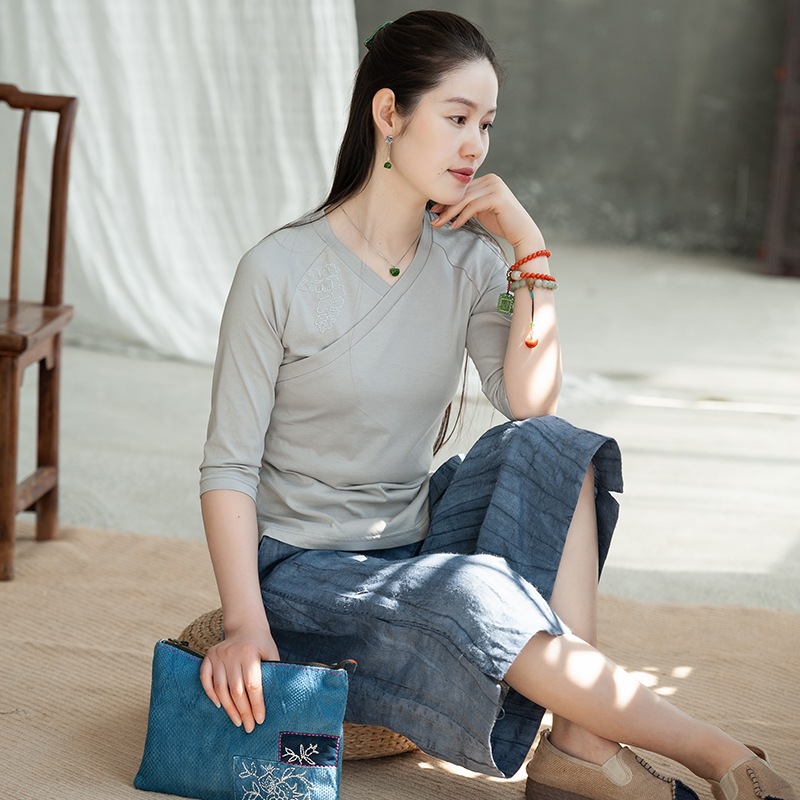 Stranger flowers bloom orchid Thunder (silent days) hand embroidered cotton T-shirt short sleeve base shirt Chinese style