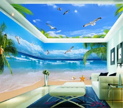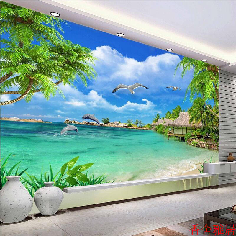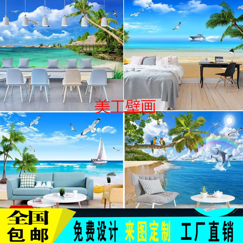 3d5D Blue sky and white clouds of sea view beach TV background murals integration board painting of living room landscape bamboo fiber plate painting