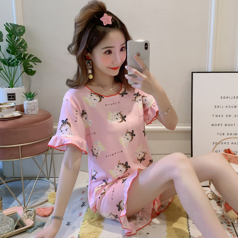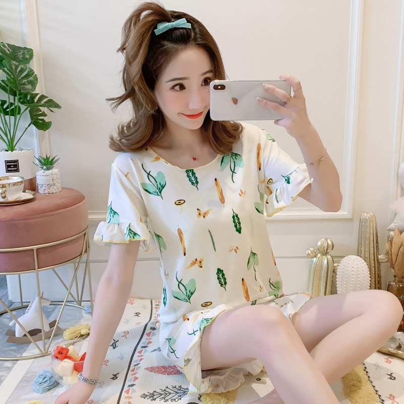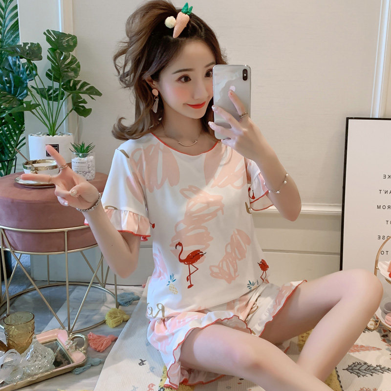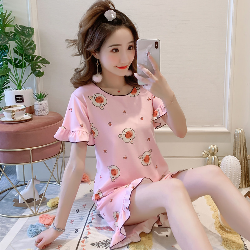 Fresh blue pig head pajamas women's summer thin short-sleeved Korean lace princess style sweet student homewear suit