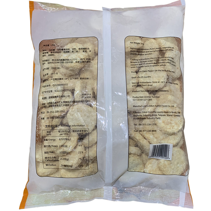 Lanton Xumei round potato cakes 2kg original F20 frozen fried potato cakes catering package frozen round potato cakes