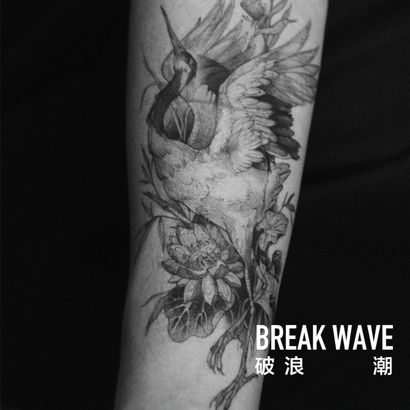 Breaking Wave Tattoo with Fairy Crane Day Style Floating Painting Lotus Flowers and Flowers Arm Calf Cool men and women Realistic Not Reflective
