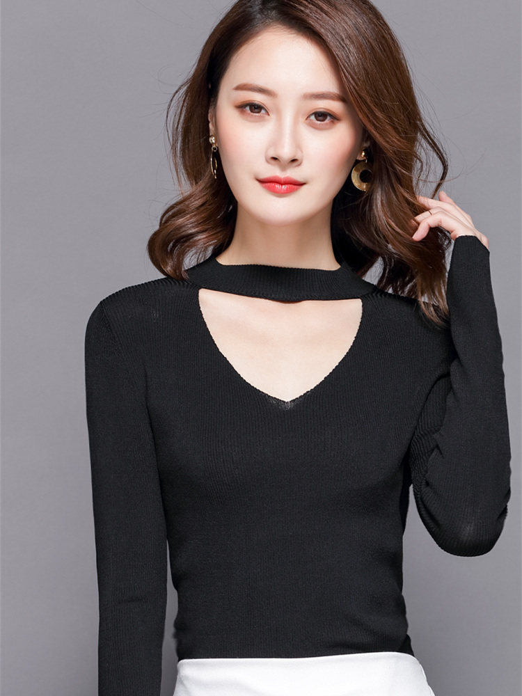 Hepburn wind hangs around neck dress French leaky bone design sensation niche spring weaving knitted knitted shirt black blouse