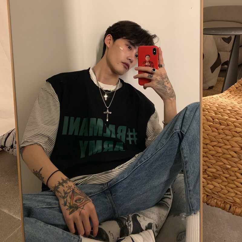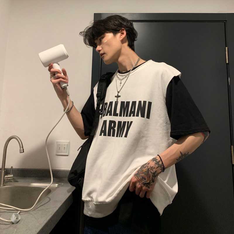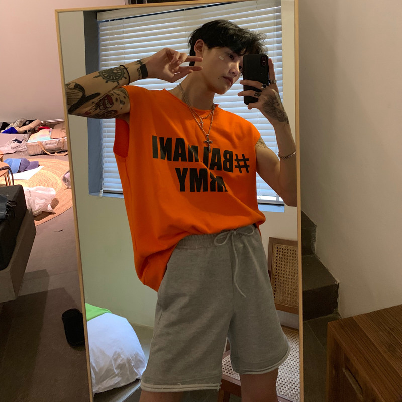 cuibuju ins Summer Korean version for men Loose Letters Printed Kan Shoulder Vest Movement Sleeveless Pure Cotton T-shirt Tide