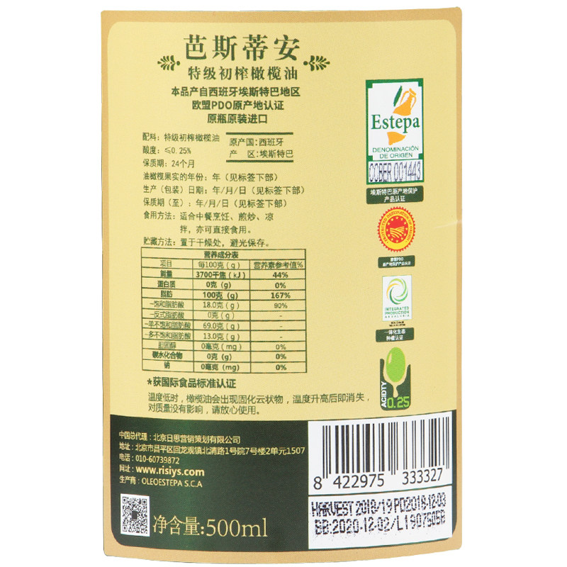 Spain original imported Bastian PDO extra virgin olive oil 500ml