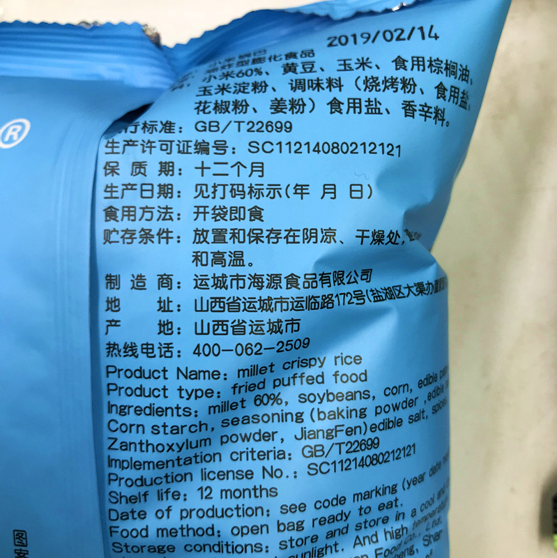 Millet 60% soybean corn edible palm oil corn starch seasoning etc.