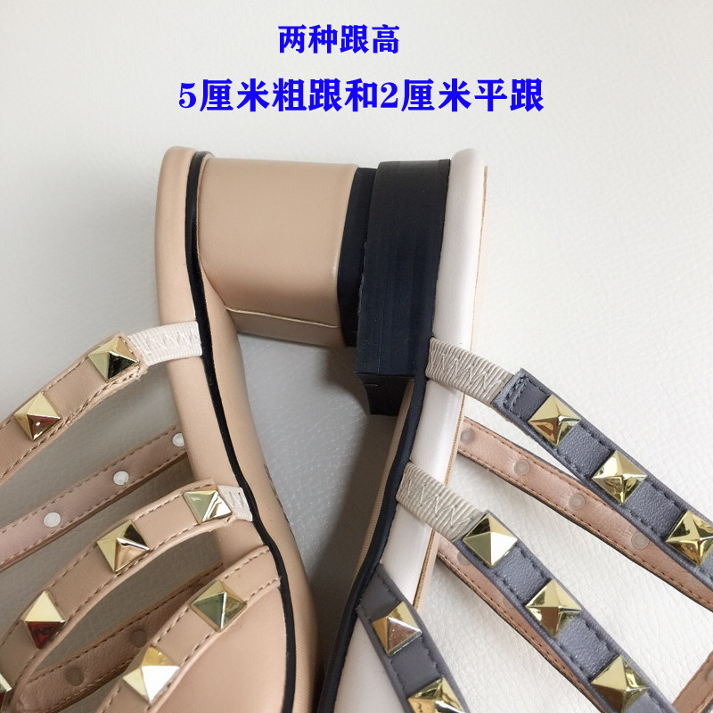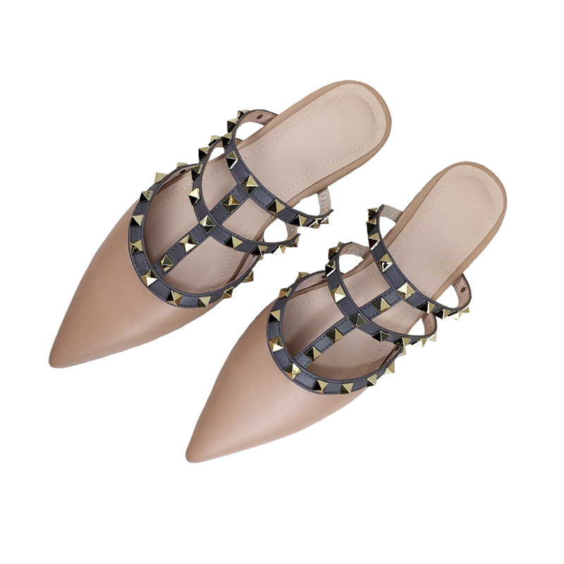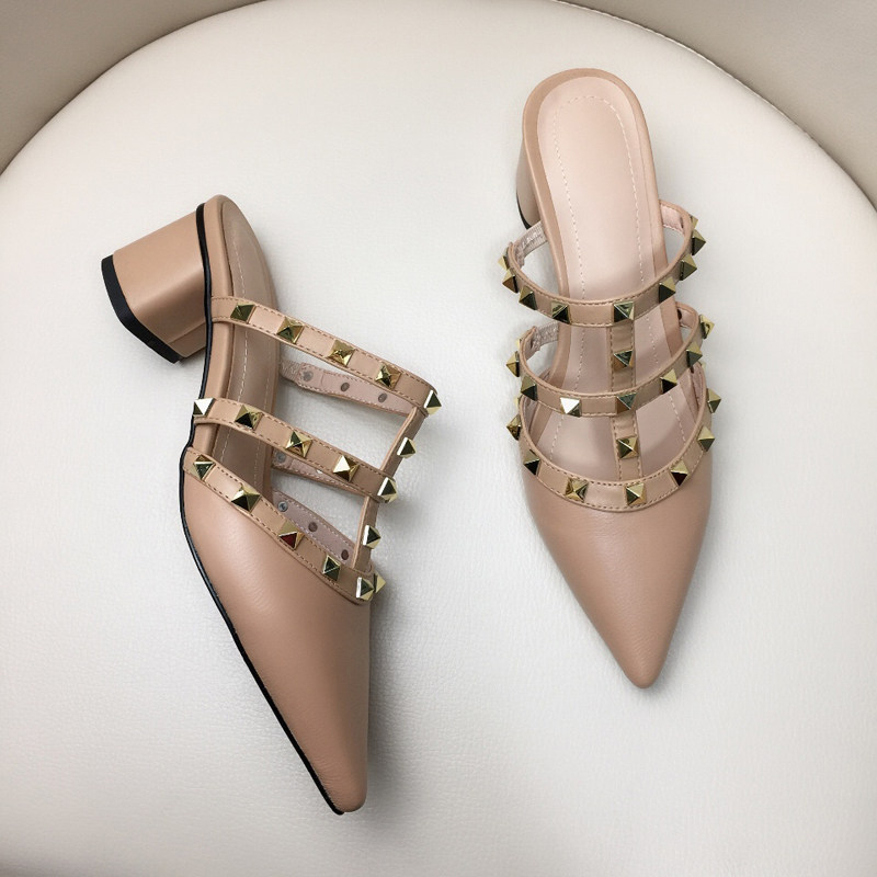 Baotou semi-slippers women's outerwear genuine leather net red half-top single shoes thick heel medium heel all-match rivets full cowhide mules