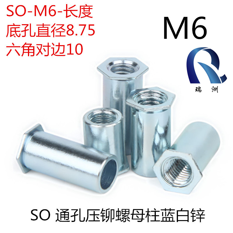 SO-M6M8 through hole press riveting stud 6-25 bore hole 8 75-11 sheet hexagonal nut column iron plated environmentally friendly blue zinc