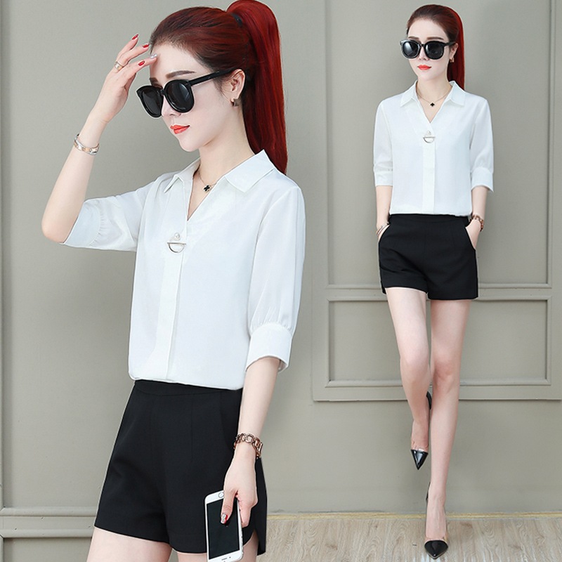 Snowspun Shirt Woman Middle Sleeve Blouse 2022 Summer New Fashion Foreign Pie V Collar Work Clothes Short Sleeve White Shirt
