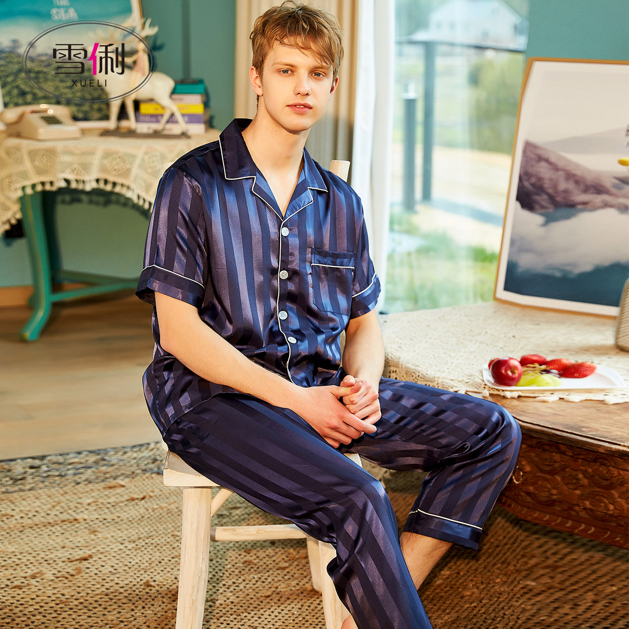 Snowy summer thin model simulation silk pajama ice silk men's short-sleeved trousers spring and autumn home clothing two-piece suit