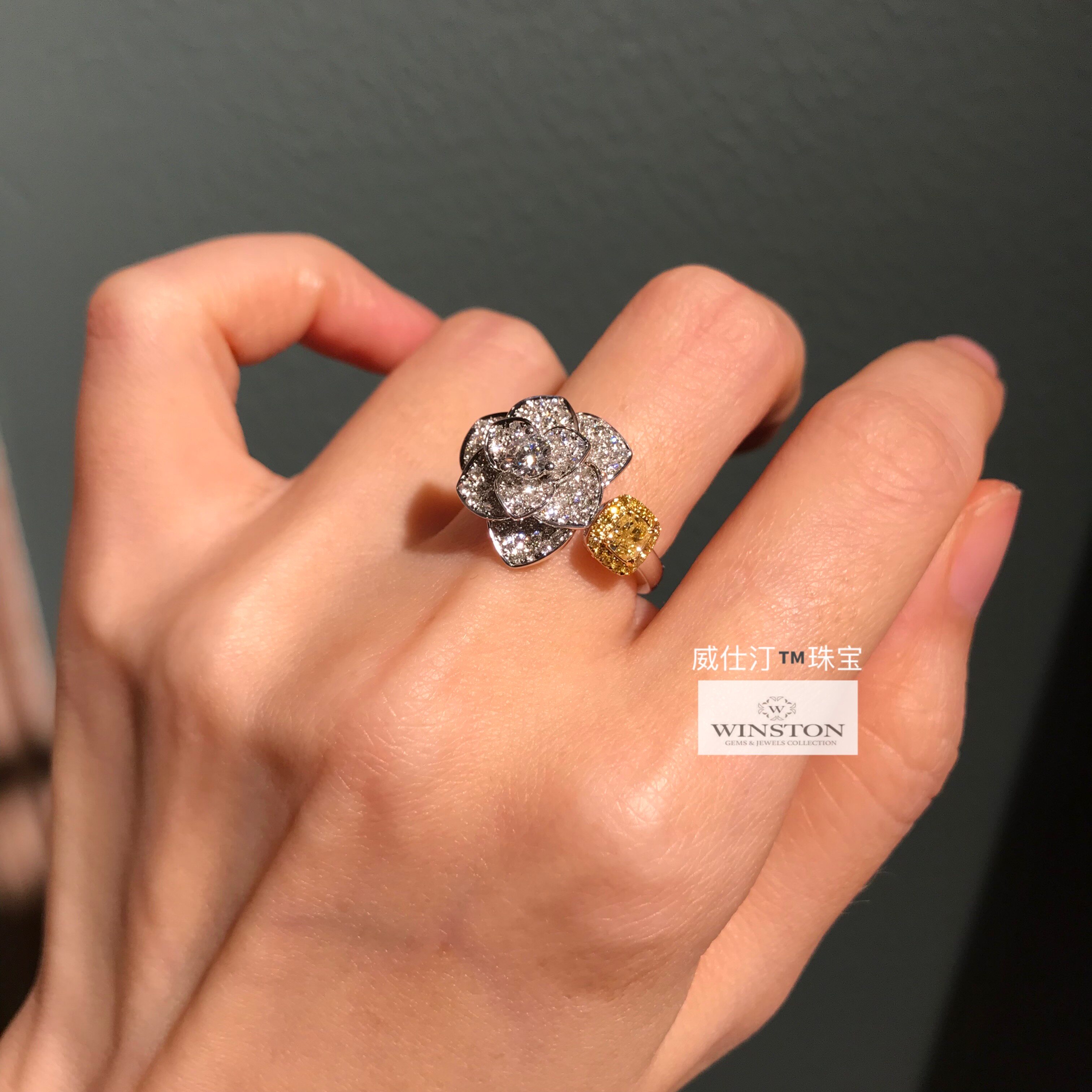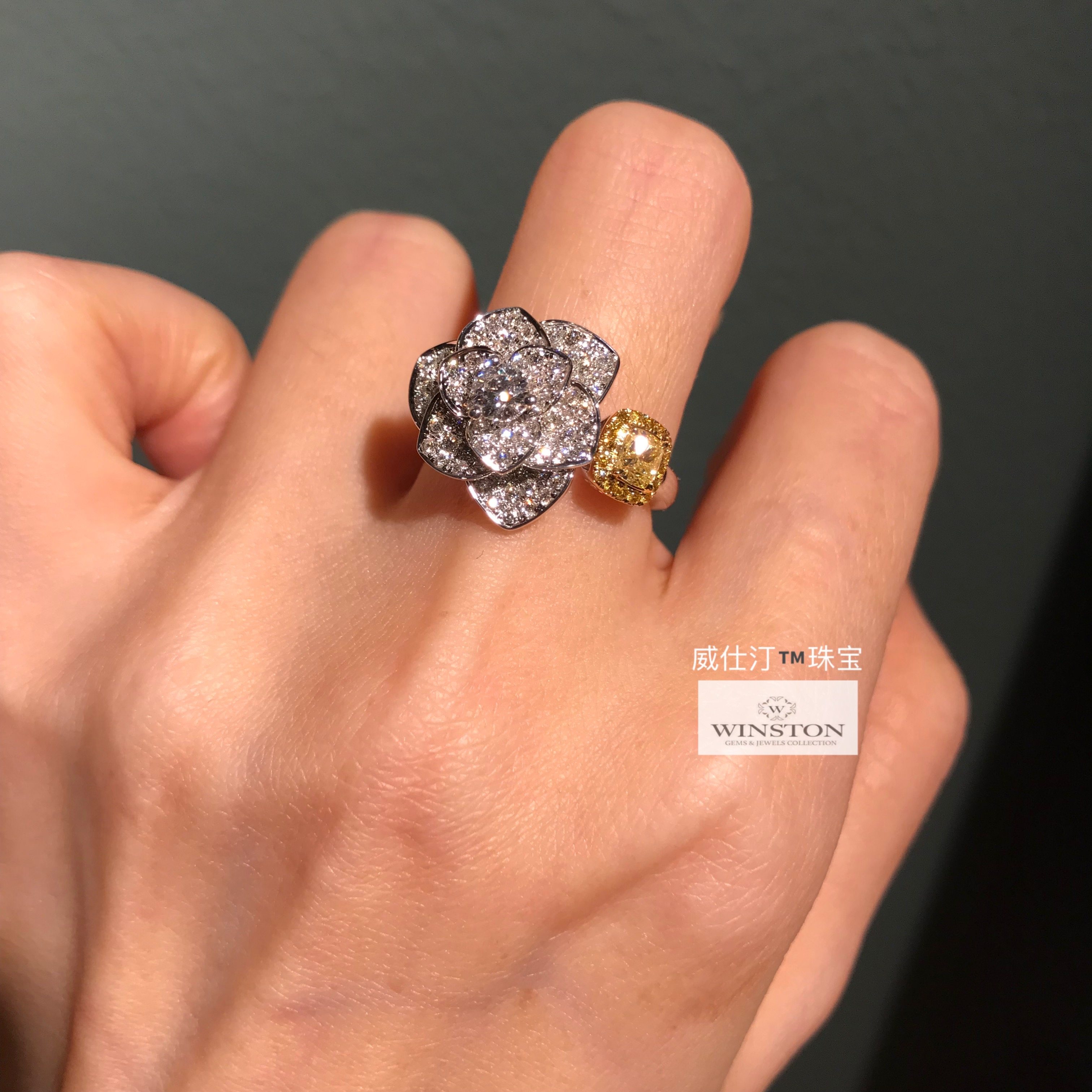 (Westing Jewelry) Earl Flower Shape Full Diamond Flower Yellow Diamond Cushion Diamond Cushion Diamond 18K Gold Ring