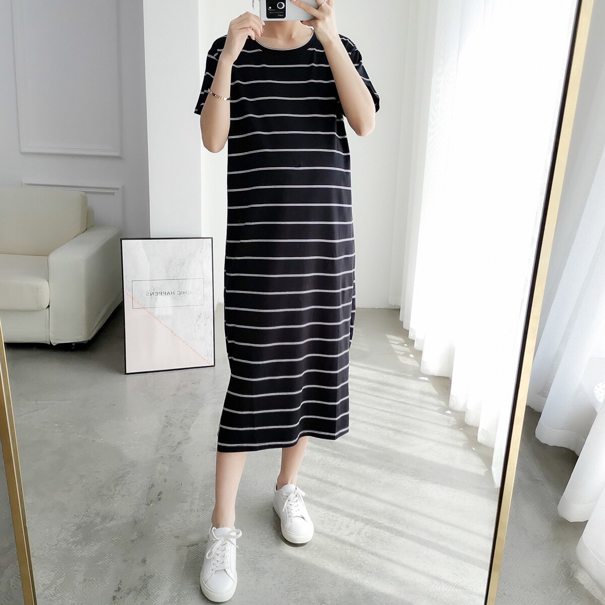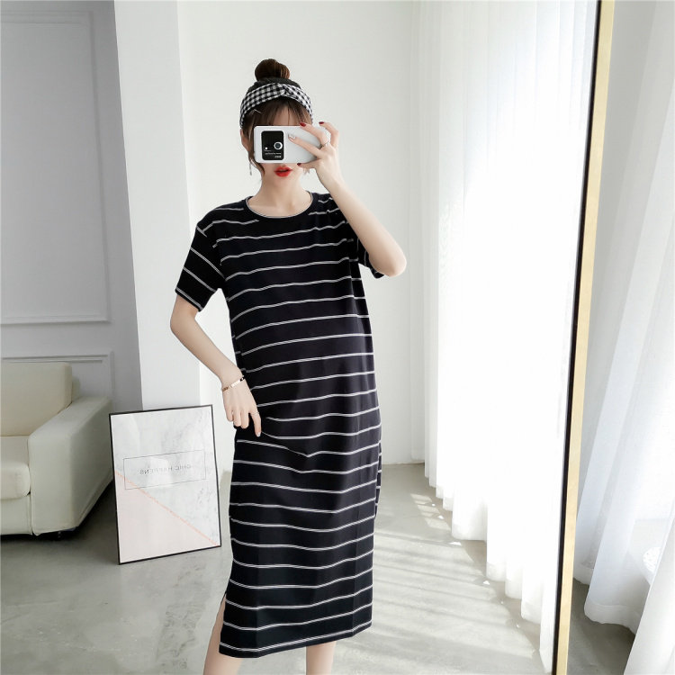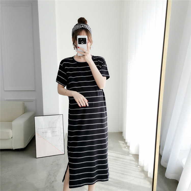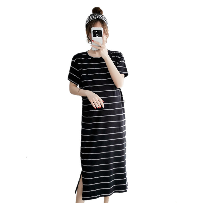 Pregnancy Woman Dress Fashion Foreign Dress 2019 New Korean Version Striped T-shirt Long Skirt Short Sleeve Pure Cotton Boomer Pregnant Woman Skirt