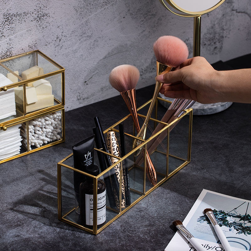 European brass makeup classification Gold glass storage box Desktop makeup brush Pearl four-grid storage ornaments