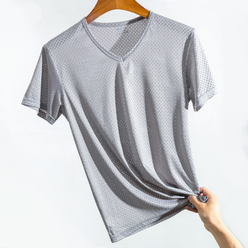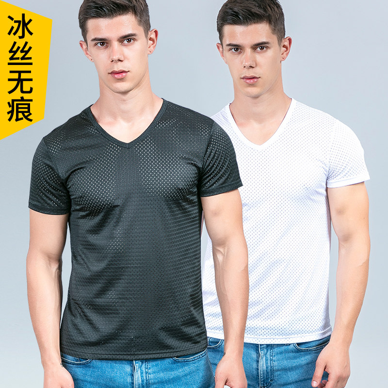 Ice wire short sleeve t-shirt men V-collar thin menu-fit elastic breathable net Young semi-sleeve shirt trend summer