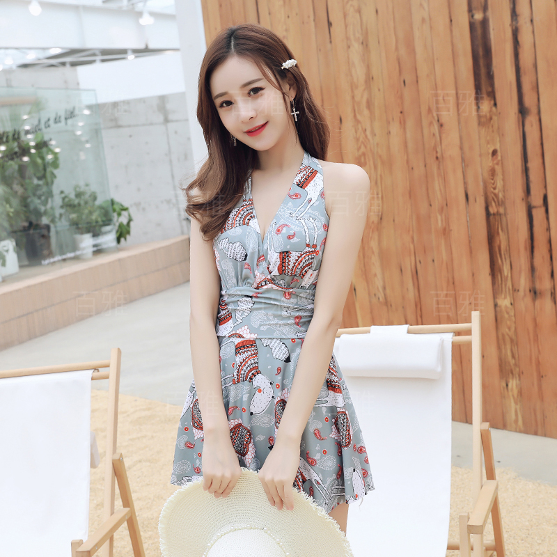 Swimsuit women's hot spring sexy little fragrant style backless small chest gathered slim boxer skirt one-piece conservative swimsuit