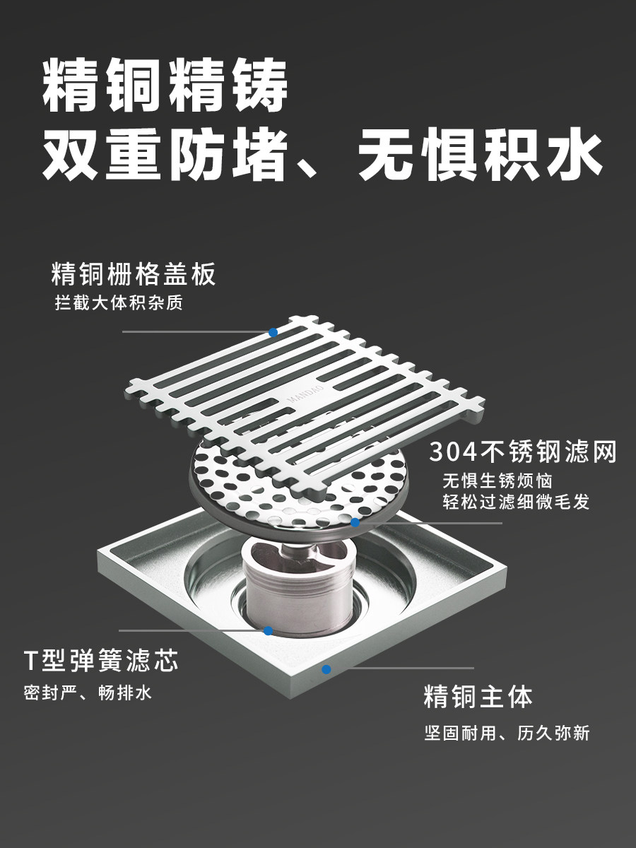 Slow road All copper floor drain Bright silver deodorant Powder room shower large displacement insect cover dual-use invisible floor drain Chrome plated