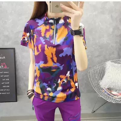 Women's quick-drying suit set short sleeve T-shirt summer light and thin breathable camouflage outdoor mountaineering hiking collar half sleeve