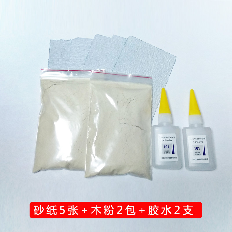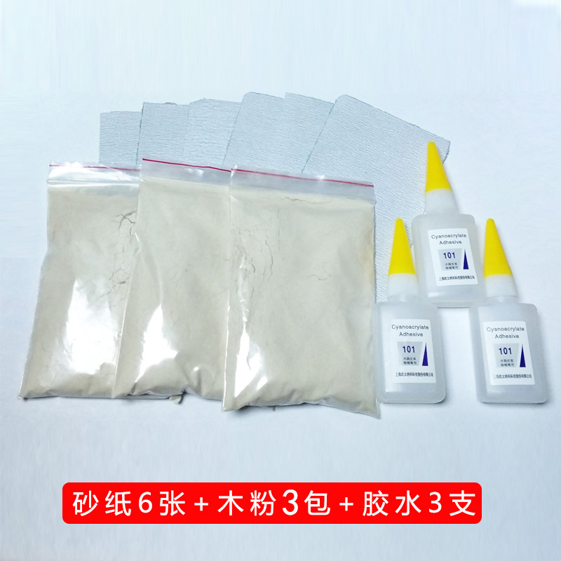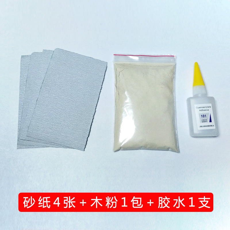 4 sheets of sandpaper, 1 pack of wood flour, 1 pack of glue, 5 sheets of sandpaper, 2 packs of wood flour, 2 packs of glue, 6 sheets of sandpaper, 3 packs of wood flour, 3 packs of glue