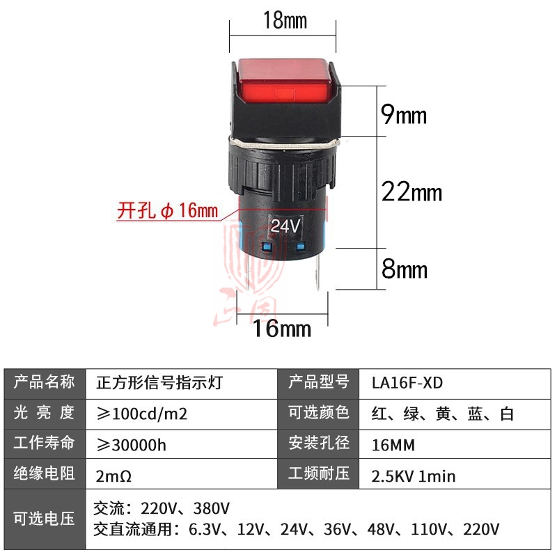 Square indicator light LA16F-XD LED rectangular power signal light distribution cabinet 2 feet welding drilling 16mm