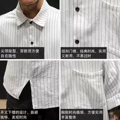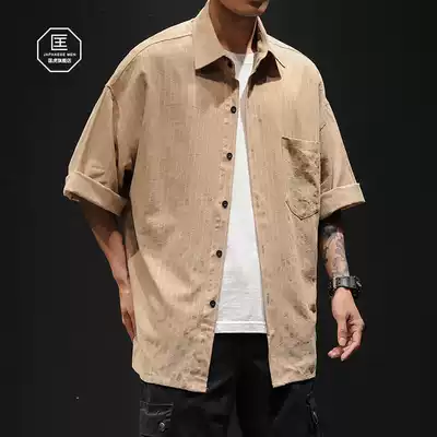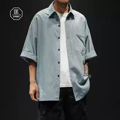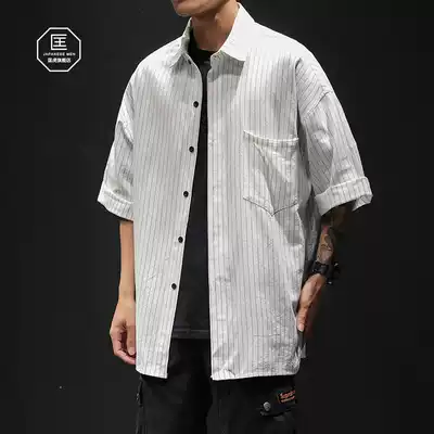 Summer Japanese vertical stripe seven-point sleeve shirt men's large size loose trend 7 points short sleeve fat Tide brand shirt