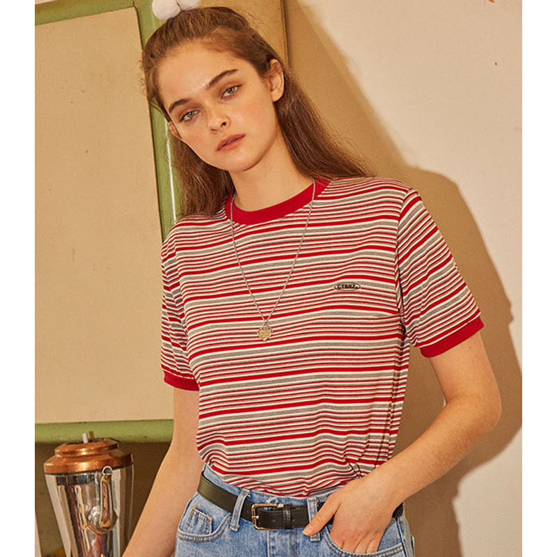 2022 summer South Korea Dongdaemun niche trendy brand retro striped slim fit cotton short-sleeved T-shirt women's college style
