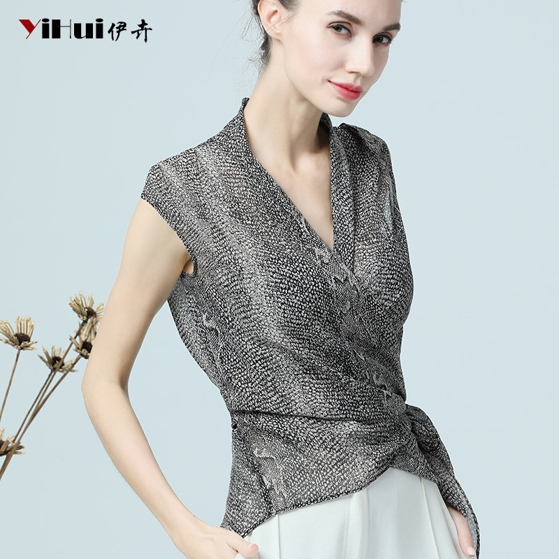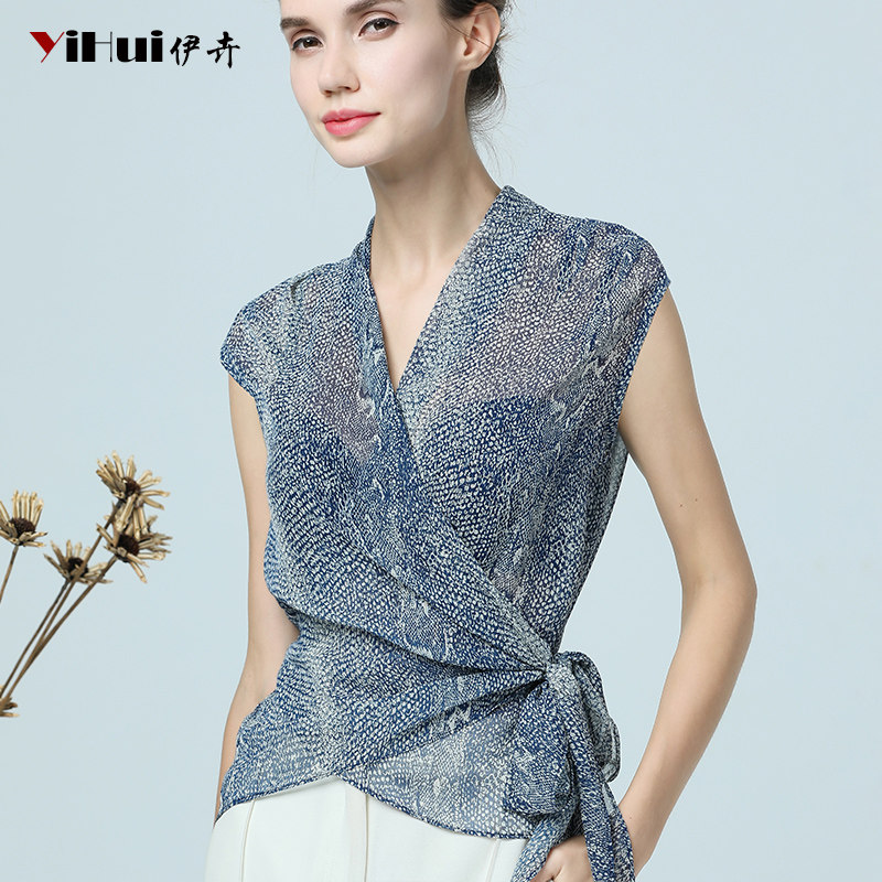 2020 summer new chiffon shirt women's short-sleeved top V-neck small shirt snake pattern shirt waist thin European goods and Foreign pie