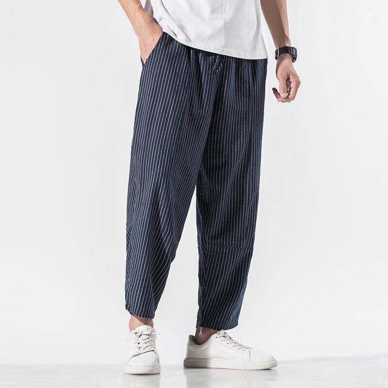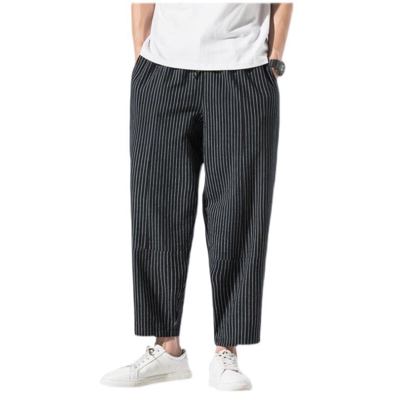 Striped nine-point pants men's summer pants retro cotton and linen casual pants plus fat plus size straight loose pants men's clothing