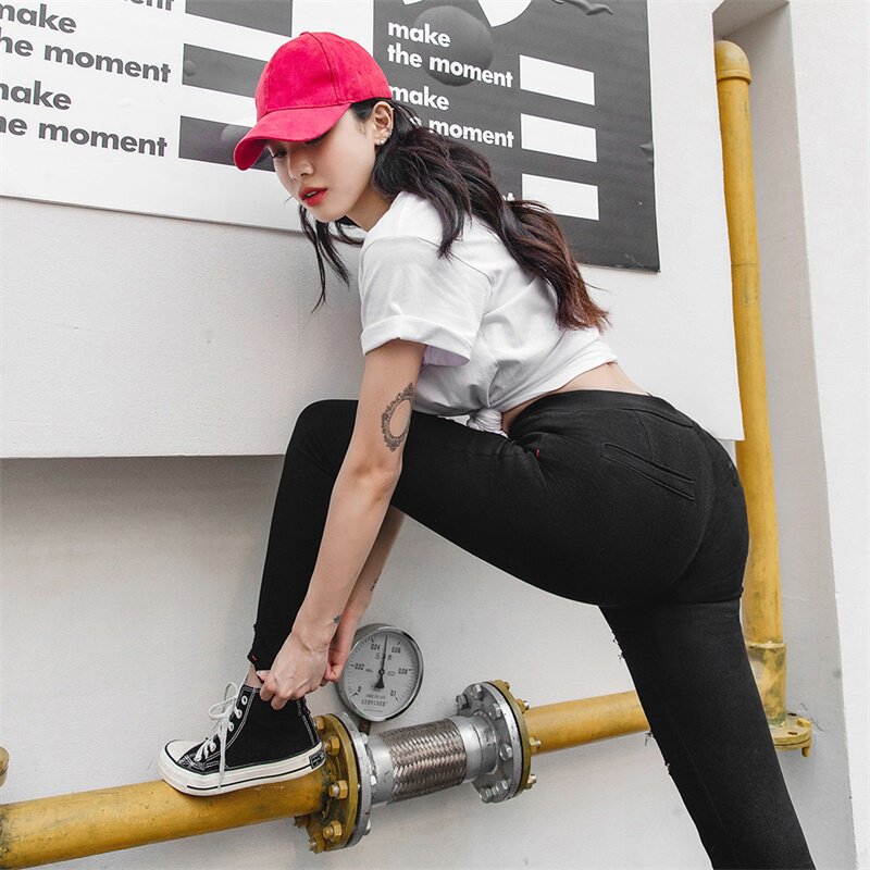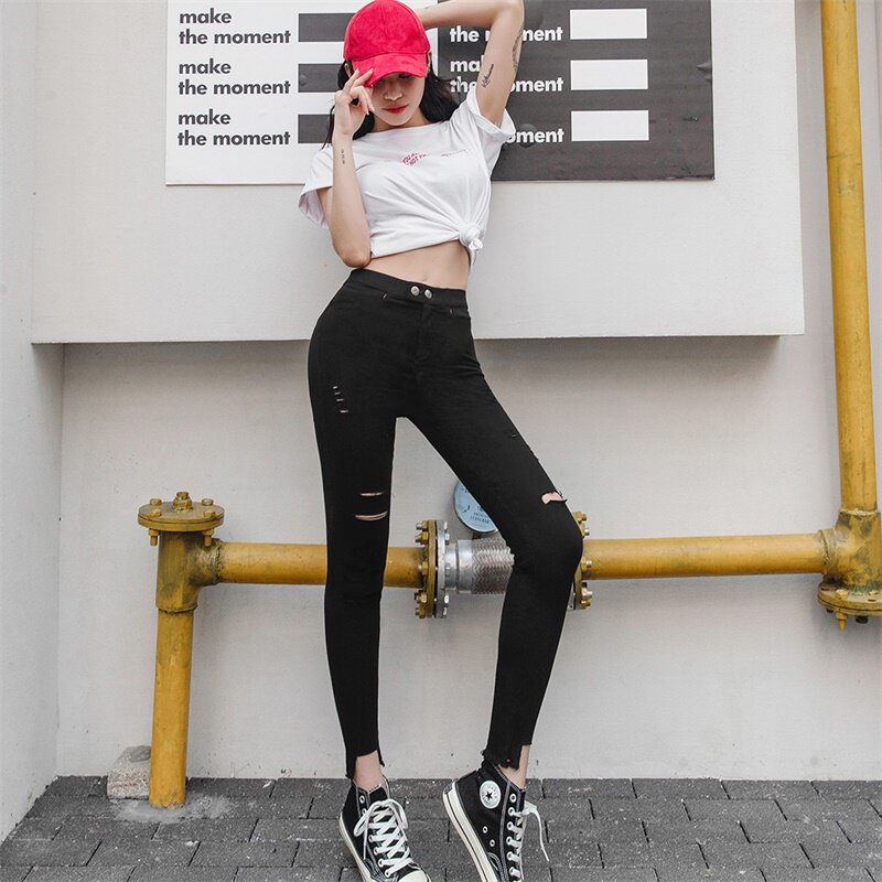 letsdiet high-waisted hole magic pants women's summer thin white black ins tide soft elastic nine points thin