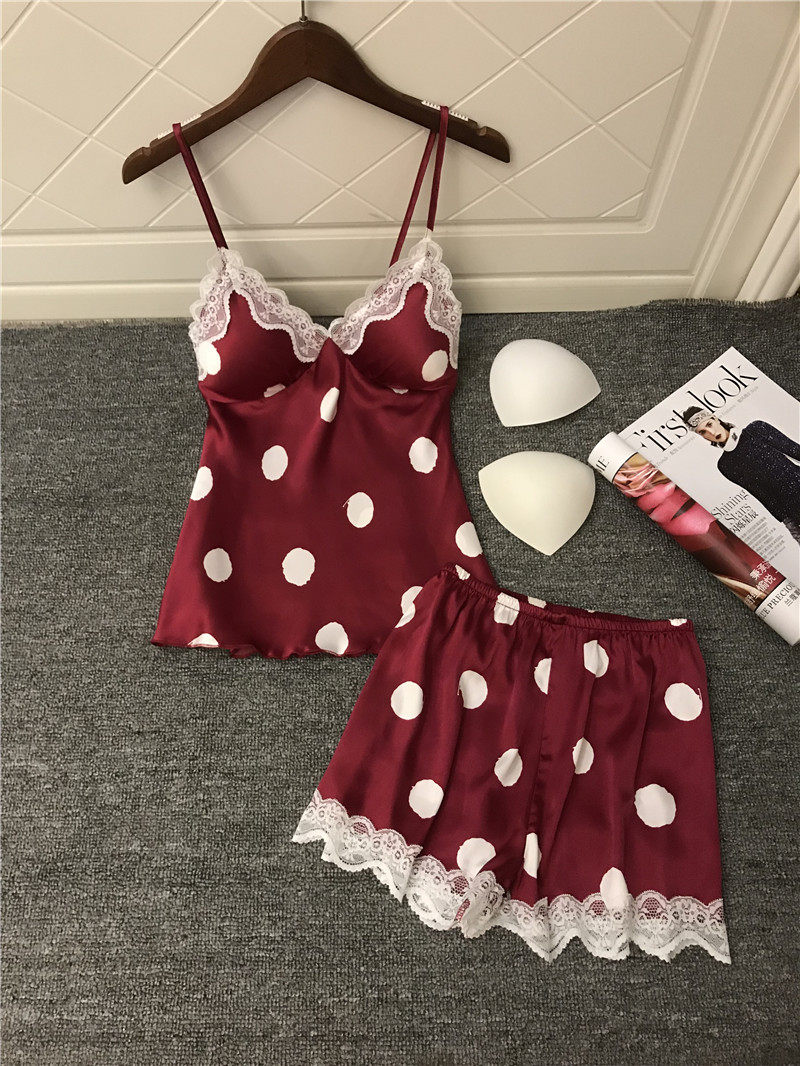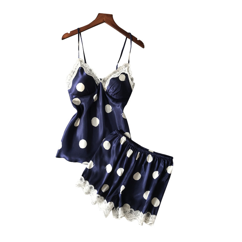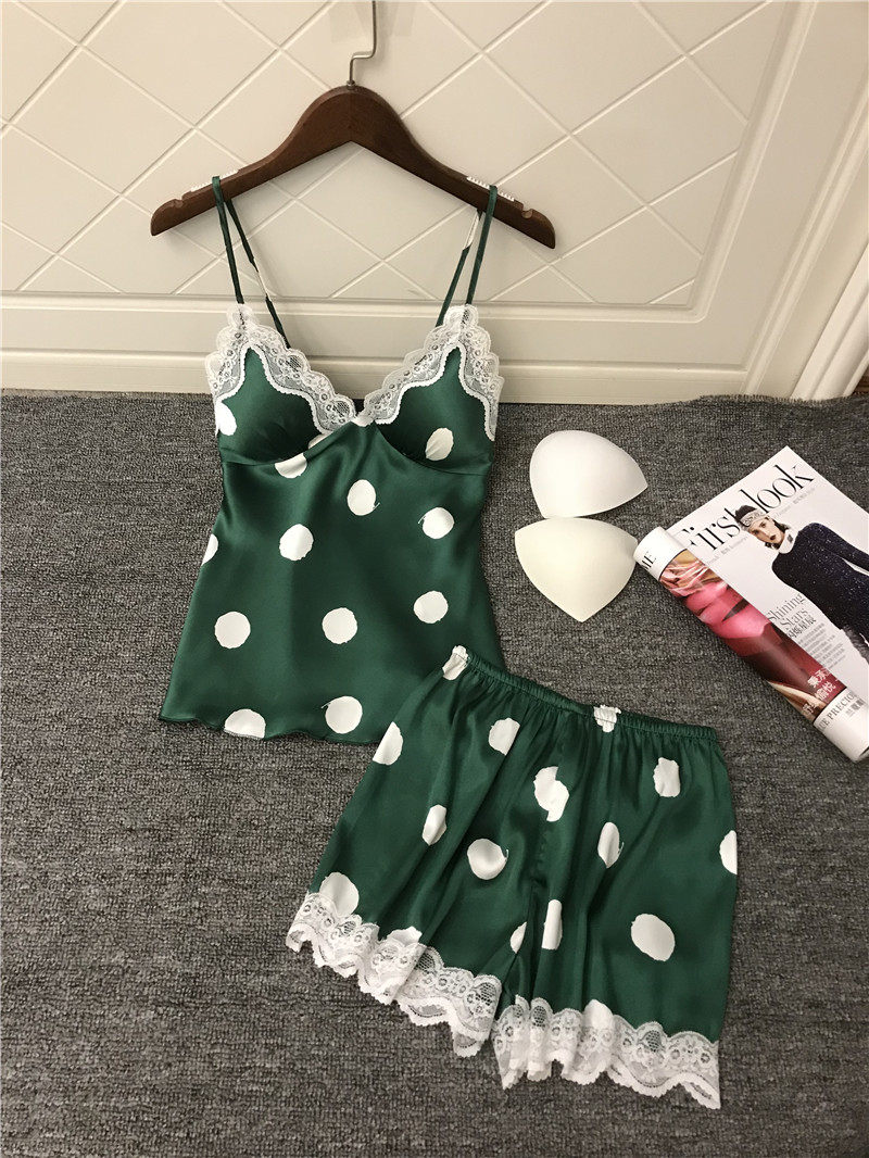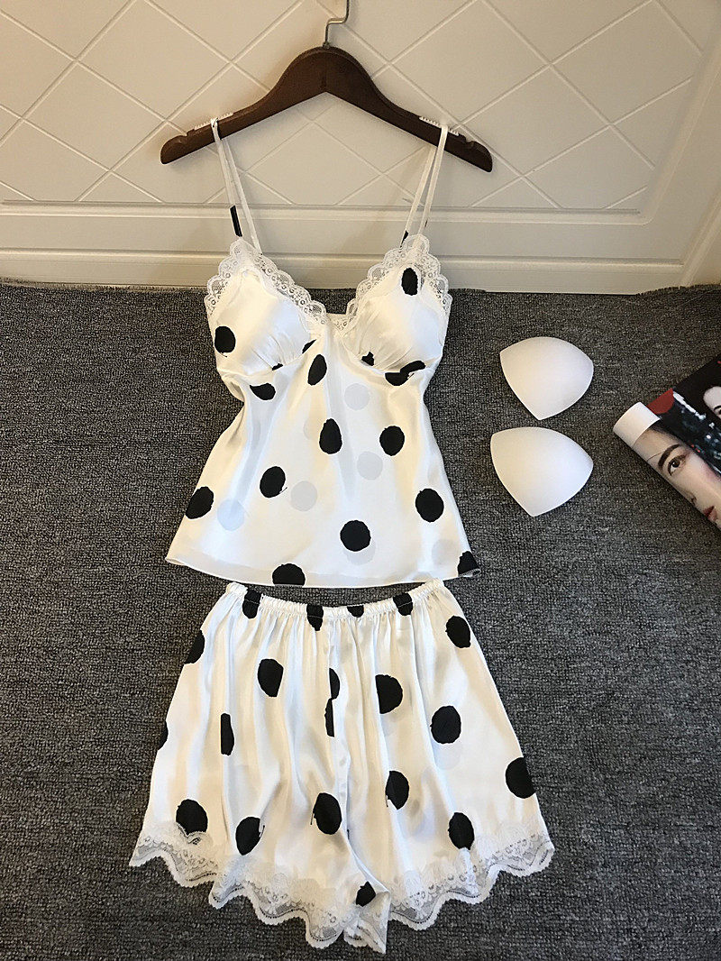 Japanese pajamas women's sexy lace with chest pad summer ice silk suspenders shorts two-piece printed home clothes