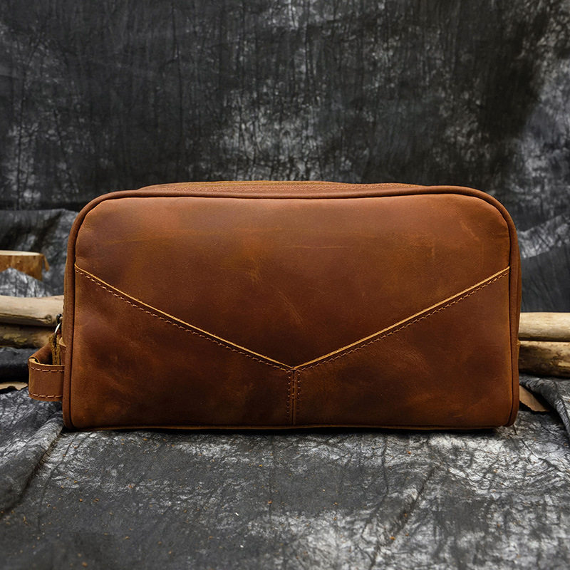 Original double zipper crazy horse skin wash bag men's leather clutch bag retro first layer cowhide large-capacity handbag