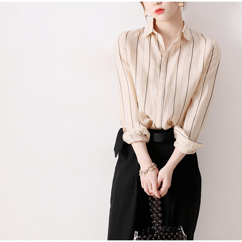 Japanese women's professional ol high-end beige customer for silver vertical stripes lapel long-sleeved small loose thin shirt