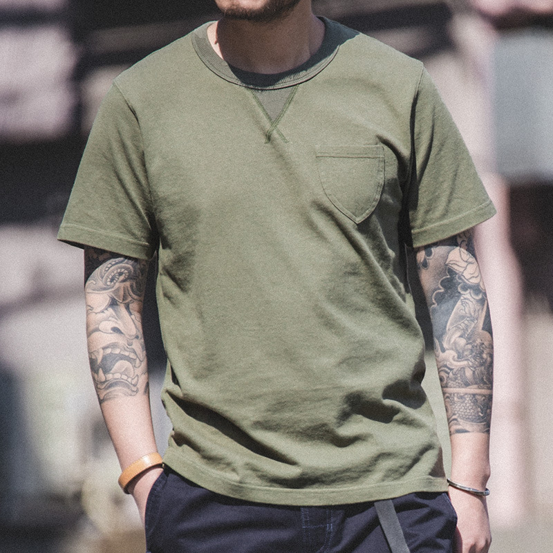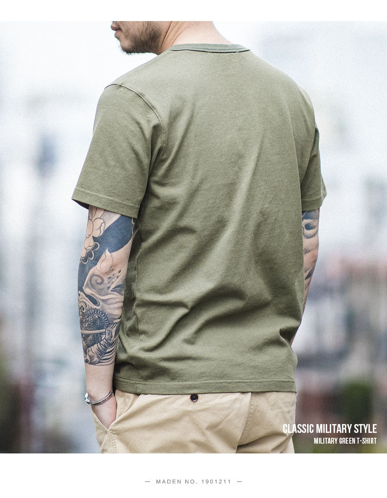 Madden tooling American retro army green T-shirt basic round neck pocket short-sleeved Ami khaki solid color T-shirt men