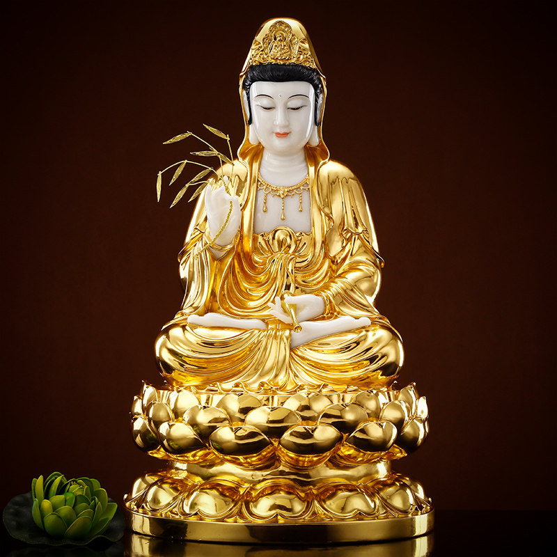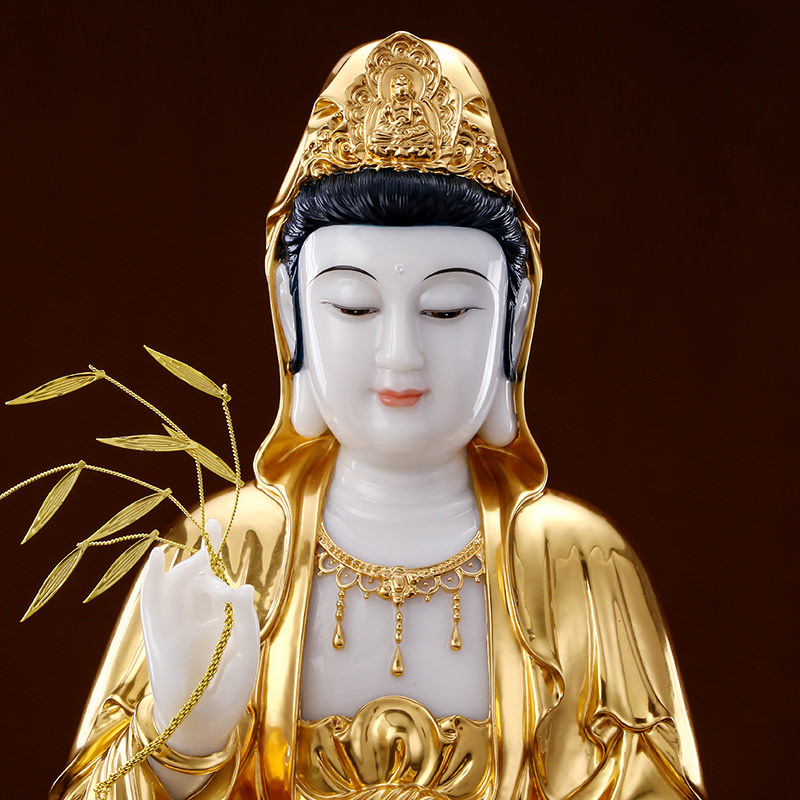 Han Baiyu gold inlaid jade Guanyin Bodhisattva home sitting lotus Guanyin Buddha statue Nanhai Guanyin home worship home decoration
