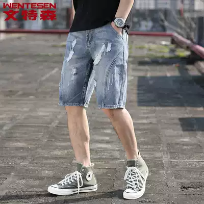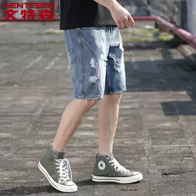 Wentsen summer hole denim shorts men's trend Japanese loose wide legs youth five casual denim pants
