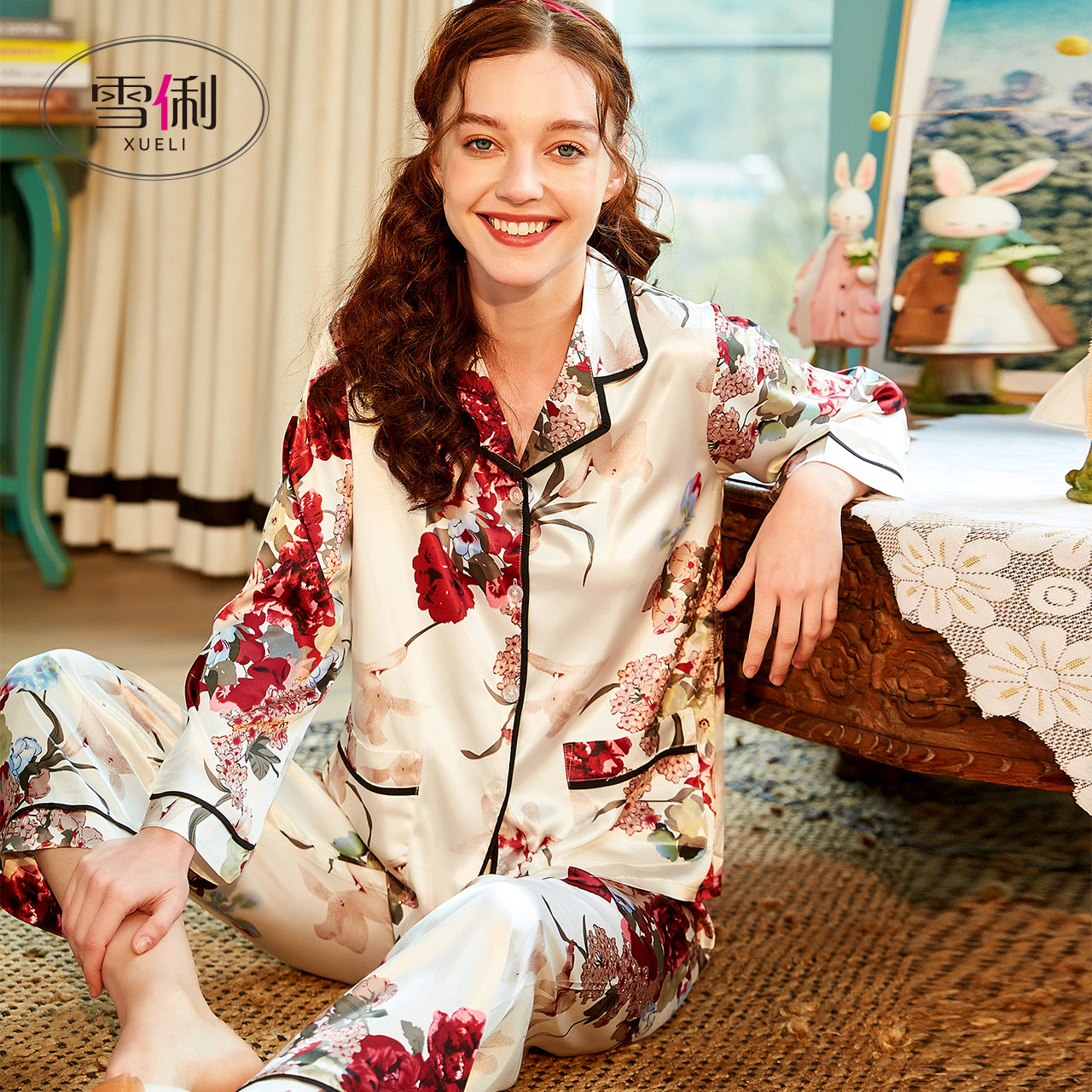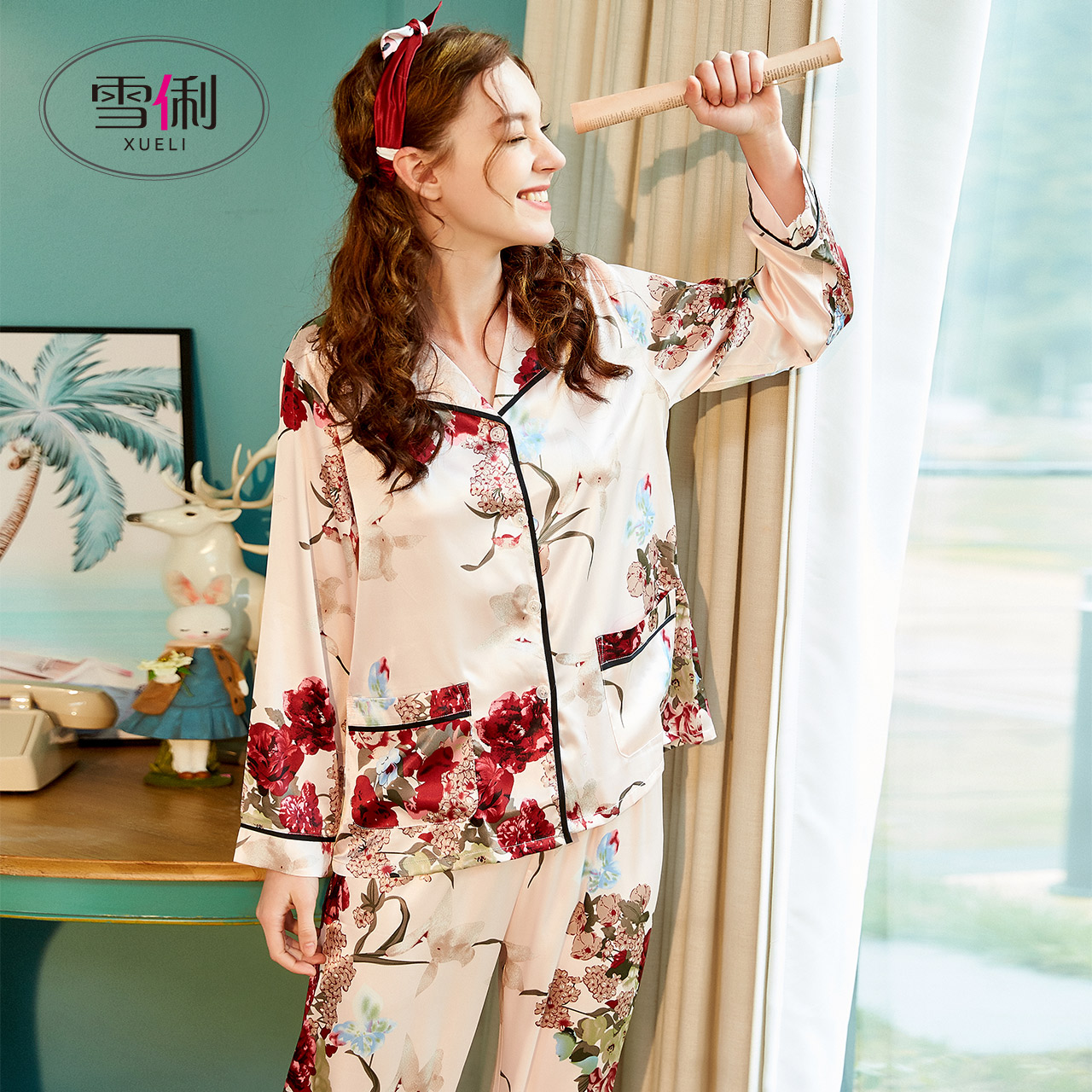 Xueli simulation silk spring and Autumn pajamas Women's long-sleeved two-piece suit sexy ice silk medium and thick home clothes