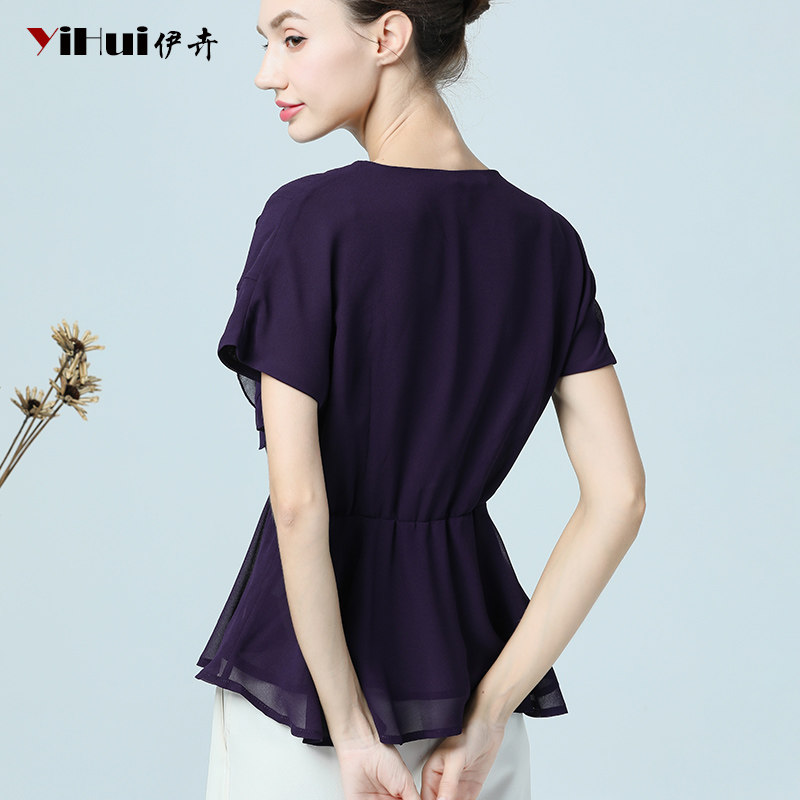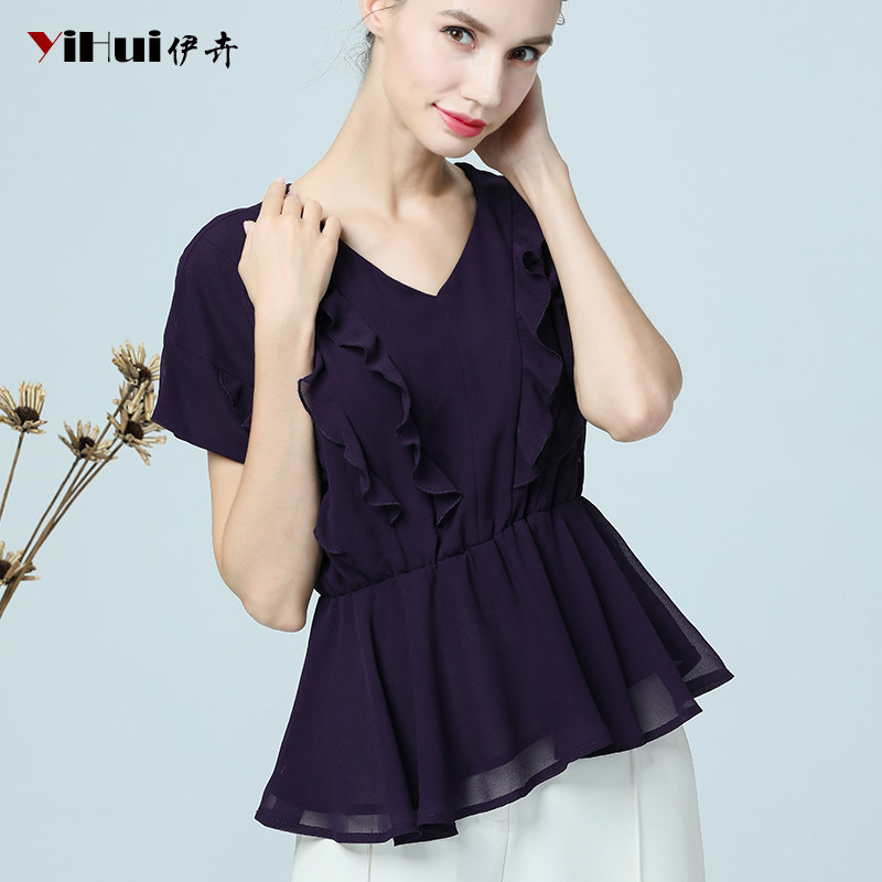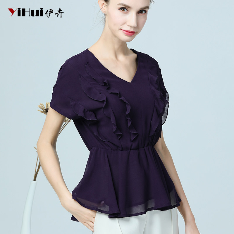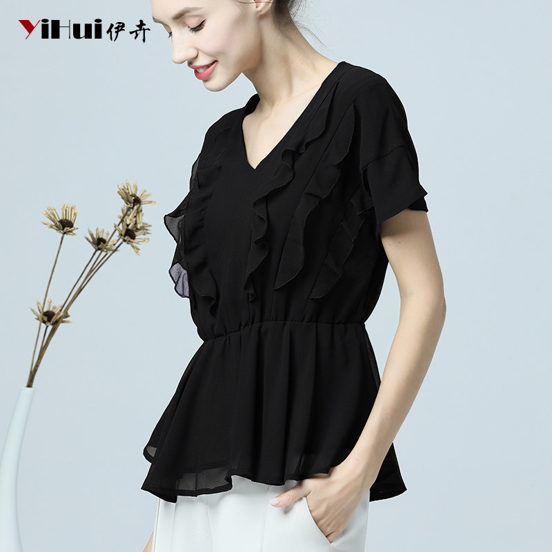 Chiffon blouse blouse waist waist show thin T shirt V collar solid color large matching flounce 2020 summer new style