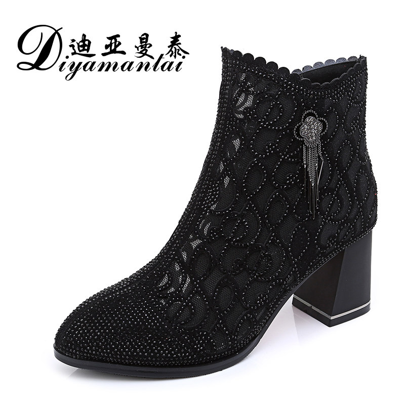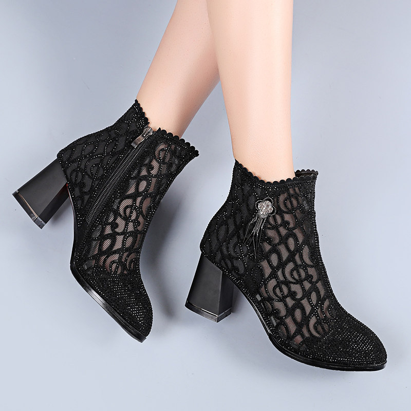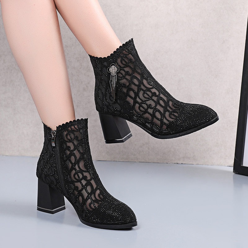 Short Boots Woman Spring Autumn Single Boots 2021 New Coarse Heel Martin Boots Women's Water Drilling Mesh Gauze Hollowed-out Boots 100 Hitch Boots