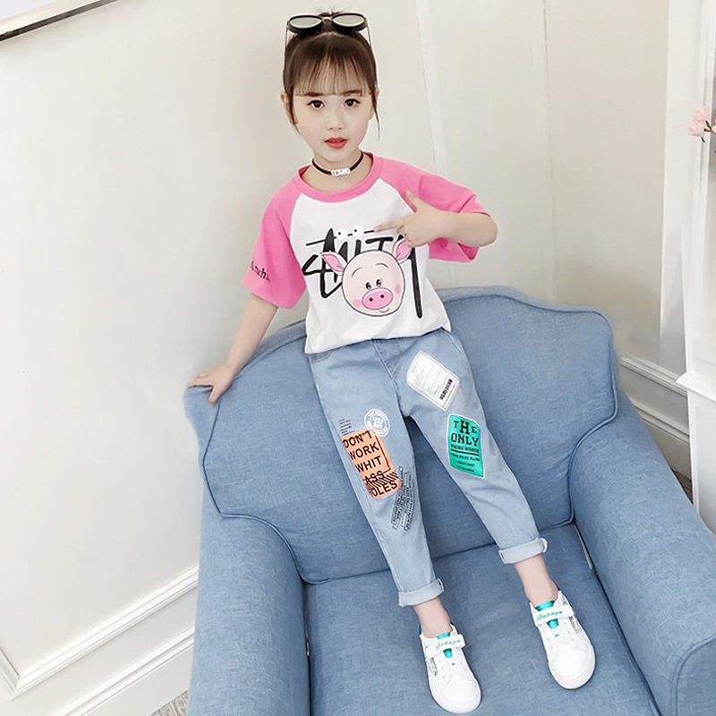 Piggy Pink White T-shirt Jeans Small Pig Pink Blue T-shirt Denim Seven-Pants Purple Smiley Face T-shirt Jeans Green Smiley Face T-shirt Denim Seven-Pants Single Denim 7-Pants Cat-Head Blouse Bull
