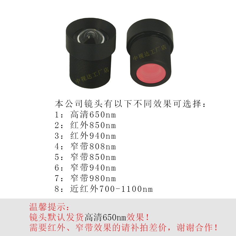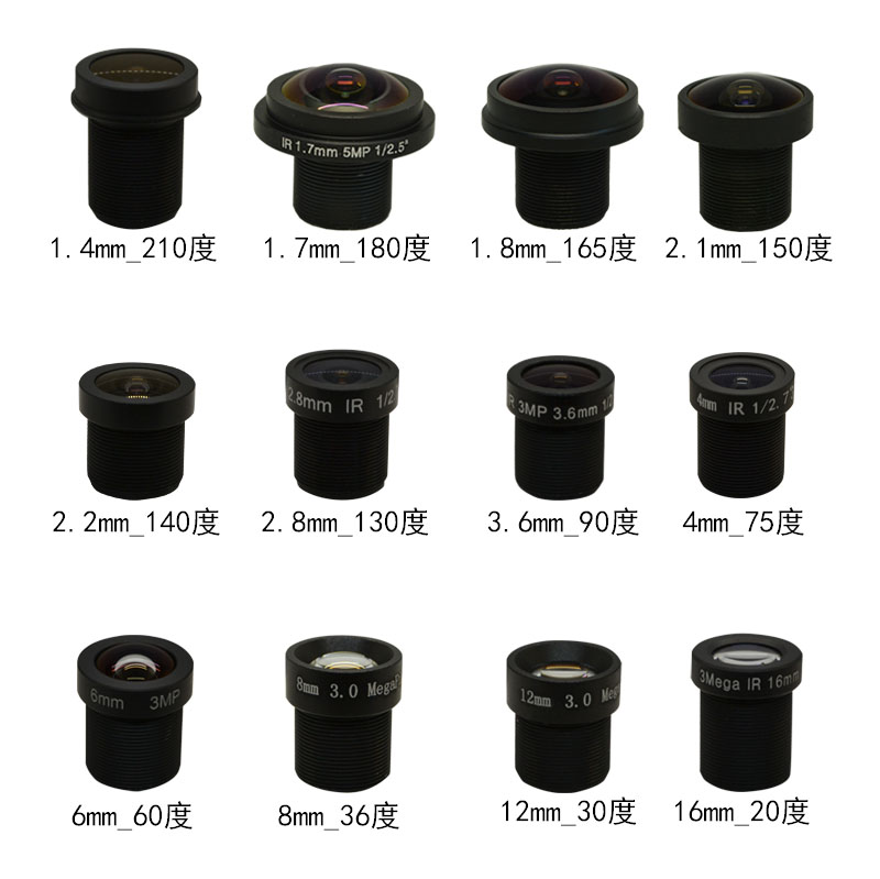1.4mm_210 degree 1.7mm_180 degree 1.78mm_190 degree (waterproof) 1.8mm_167 degree (waterproof) 1.8mm_165 degree 2.1mm_150 degree 2.2mm_145 degree 2.5mm_120 degree (waterproof) 2.8mm_120 degree 3.6mm_90 3.6mm_90 degree (no distortion) 3.6mm_90 degree (waterproof) 4mm_75 degree 4mm_70 (starlight level) 4mm_ 70 degrees (black light level) 6mm_60 degrees 6mm_60 (starlight level) 6mm_60 degrees (black light level) 8mm_36 degrees 12mm_30 degrees 16mm_20 degrees 25mm_15 degrees 35mm_10 degrees (no distortion)