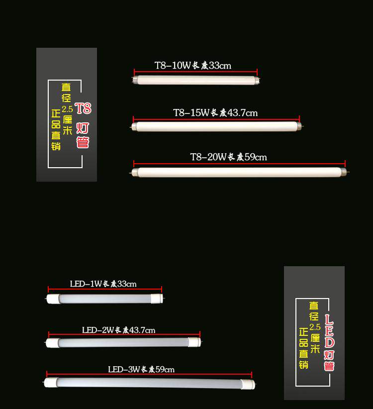T8 15W (33cm long) 2 pieces T8 20W (43 7cm long) 2 pieces T5 10W (28 5cm long) 2 pieces T5 8W (