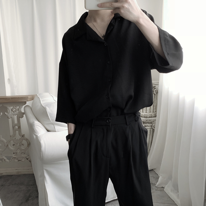 Mr short sentence dark abstinence five-and-a-half-sleeve shirt men's summer thin black casual loose-fitting versatile shirt