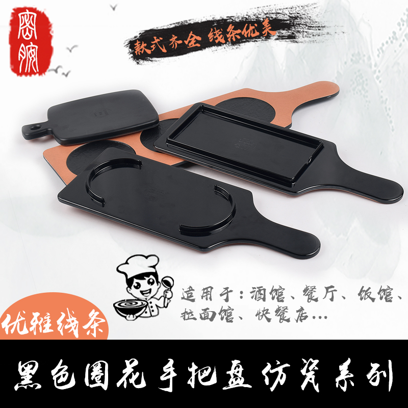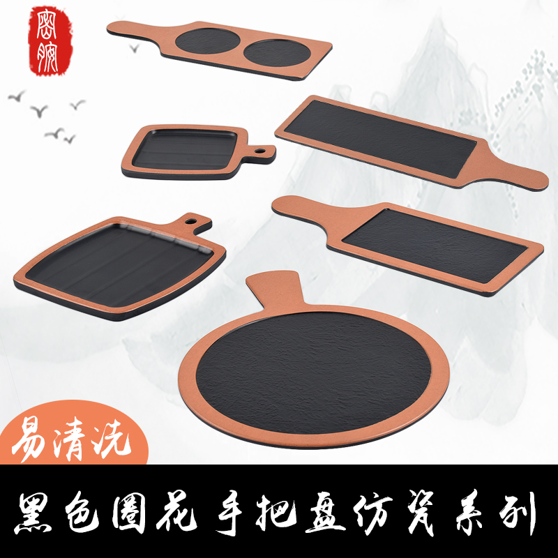 Black circle flower hot pot barbecue plate rectangular slate flat plate imitation porcelain plastic sushi sashimi handle pizza plate