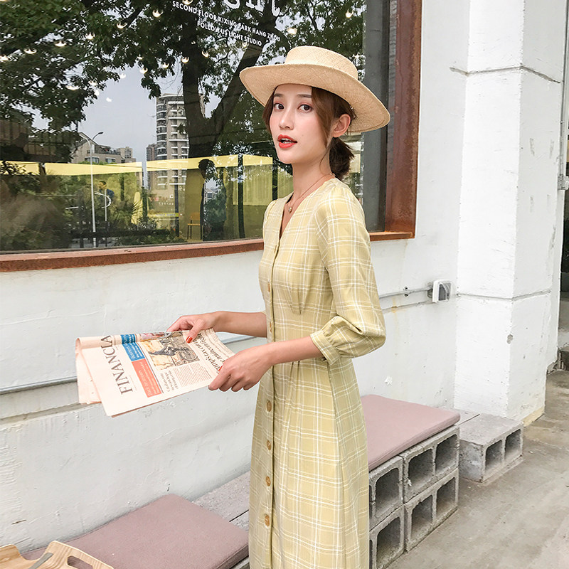 2022 new summer wise lavender style high waist retro cogled women's V collar single row with yellow plaid one-piece dress