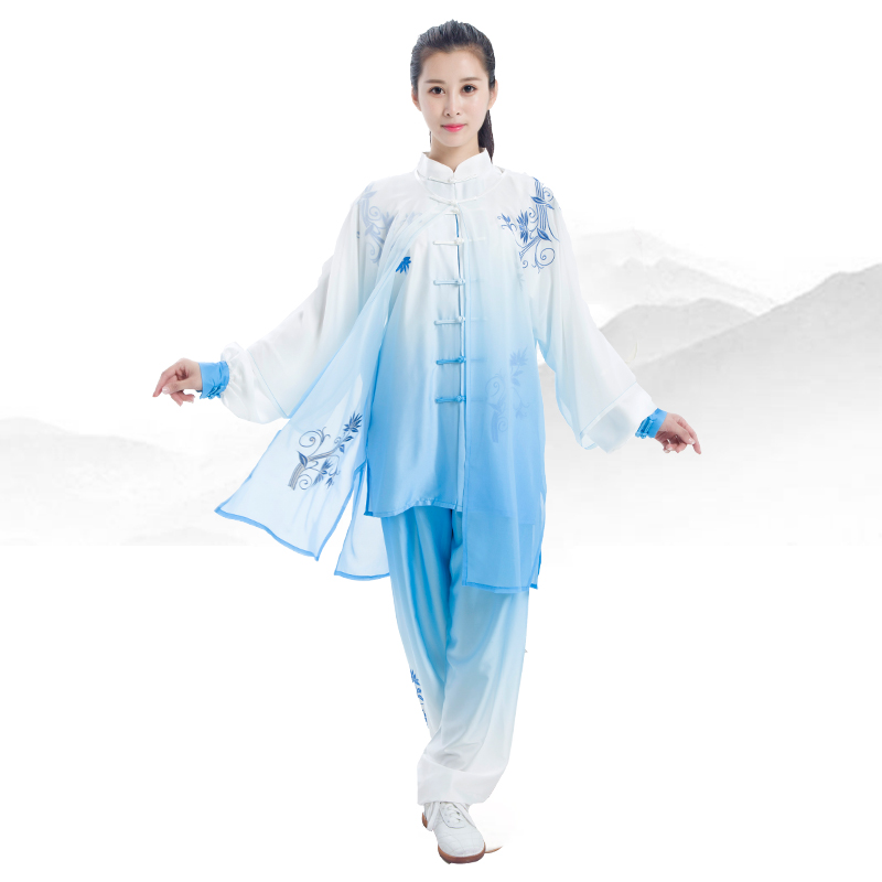 Tai Chi clothing women's new blue and white porcelain gradient color veil three-piece suit martial arts practice men's and women's embroidery competition performance clothing