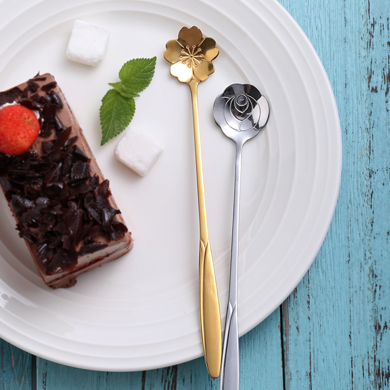 Coffee spoon European small luxury stainless steel mesh red cherry blossom spoon long handle creative personality cute stirring shallow spoon