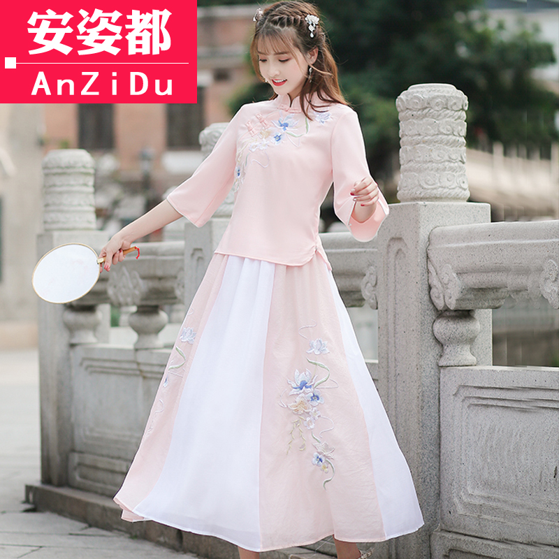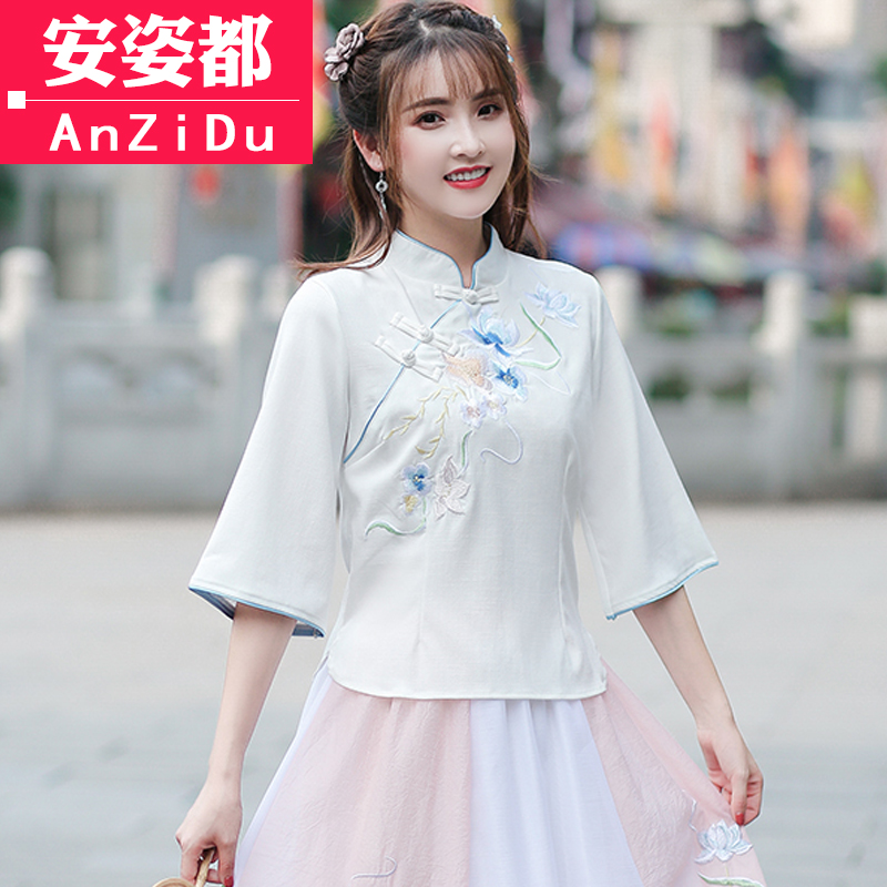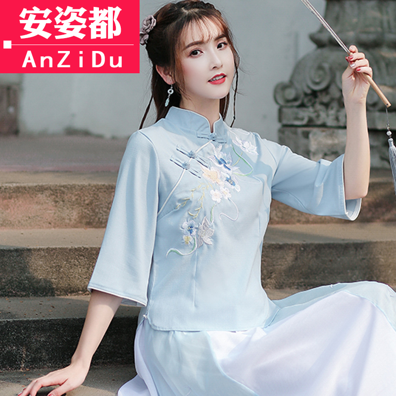 Chinese style with less female clothing Improved qipao blouses Chinese style Tang suit suit Xia comeback with Chinese wind cotton linen tea suit