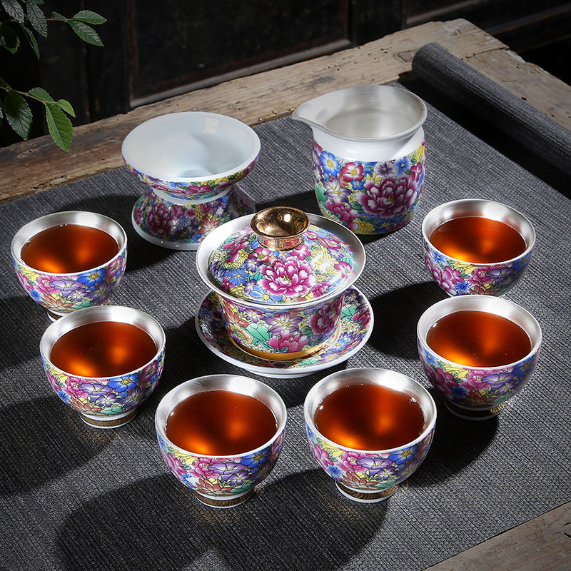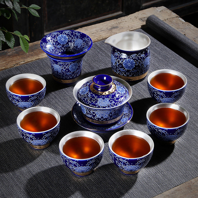 Silver-gilt Bianhua cover bowl set Silver-plated Bianhua teapot set Bianyin blue-and-white porcelain teapot set A silver-plated blue-and-white porcelain teapot set A silver-plated bowl set Bianhua set Bianhua teapot set